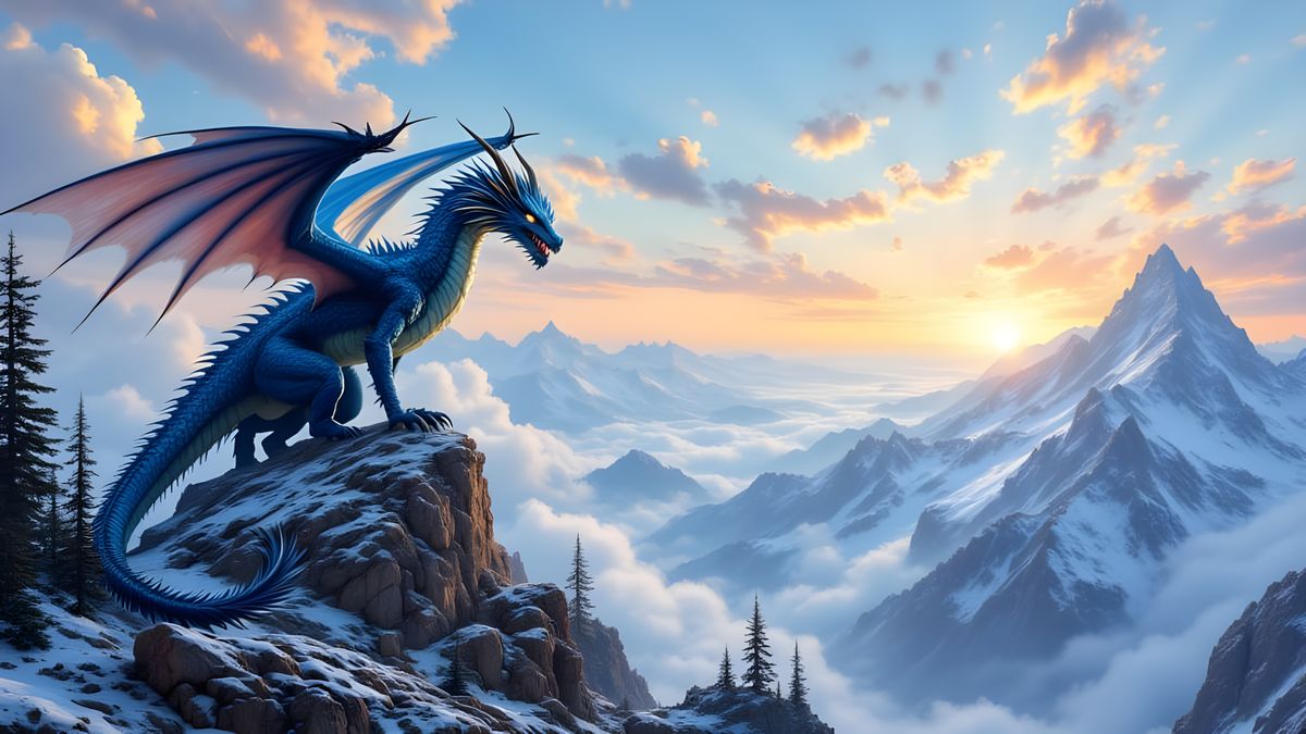 This image shows a detailed blue dragon on a snowy mountain. The dragon's wings shimmer with iridescent colors in the sunlight, overlooking a landscape of jagged rocks and windswept pines in a fantasy style.