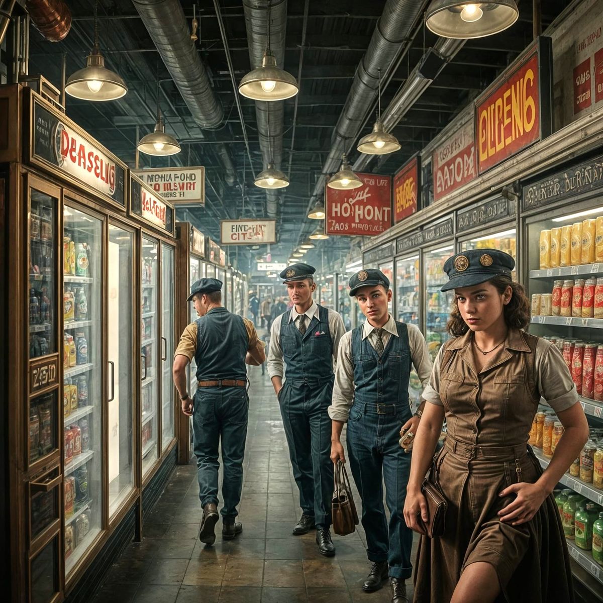 This image depicts a bustling 1940s diesel punk supermarket, showcasing men and women shopping together in a unique blend of industrial and retro aesthetics.