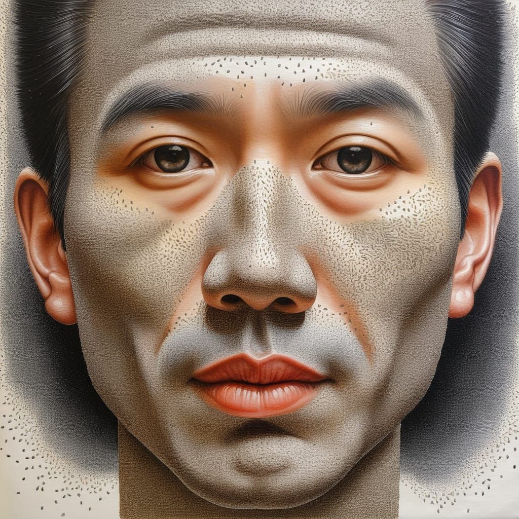 A detailed portrait of a man's face. Half of his face is artistically covered in sesame and poppy seeds, rendered with crayon on paper with intricate detail.