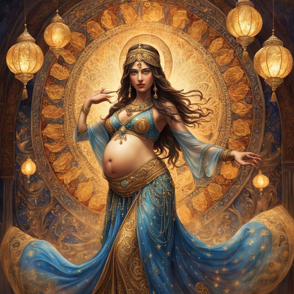 This image shows a pregnant Virgin Mary as a belly dancer in a Middle Eastern setting. Golden lanterns and intricate patterns add to the mystical, exotic beauty, with warm, golden lighting.