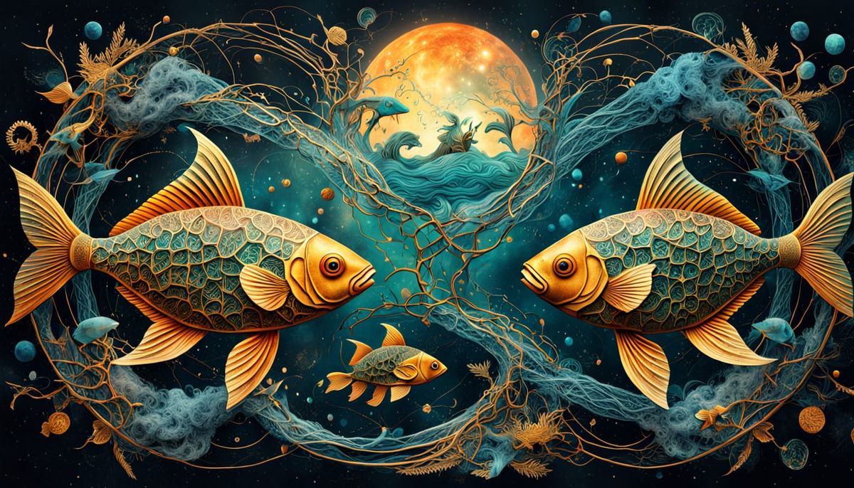 This vibrant, dreamlike image features two fish swimming in swirling water, surrounded by cracked mirrors, glowing creatures, and intricate textures. A blend of astrological design and serene nature scenes, set against a warm sunset glow with golden hues and iridescent colors.