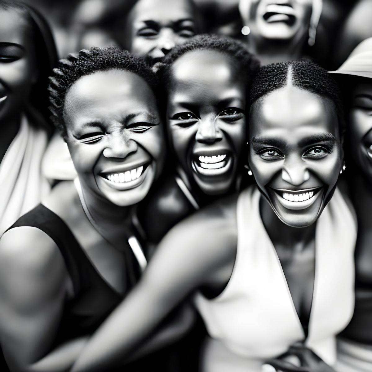 This image shows a close-up portrait of a group of black women friends smiling and having fun. The image uses ambient light and is reminiscent of fine art portraiture.
