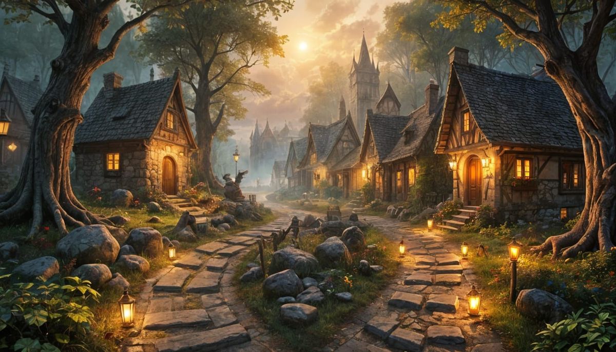 This image shows a serene medieval village bathed in the soft glow of lanterns, set amidst a lush forest, with a winding cobblestone path leading to a mystical realm of wonders, blending the styles of surreal oil painting and vibrant color splatters.