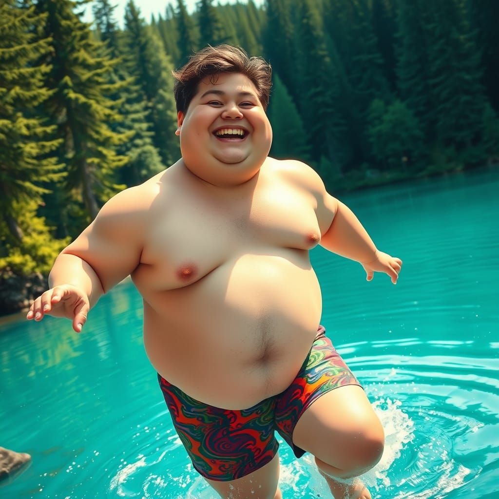 This image shows a joyful young man leaping from a turquoise lake into the air. The surrounding forest is lush and vibrant, and the scene is rendered in a psychedelic realistic style.