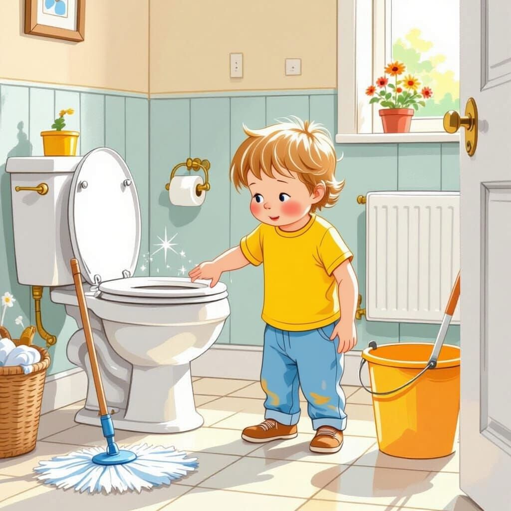A child in a yellow shirt proudly announces they cleaned the toilet. This charming illustration captures a heartwarming moment with intricate details and textures, evoking a whimsical, cozy atmosphere.