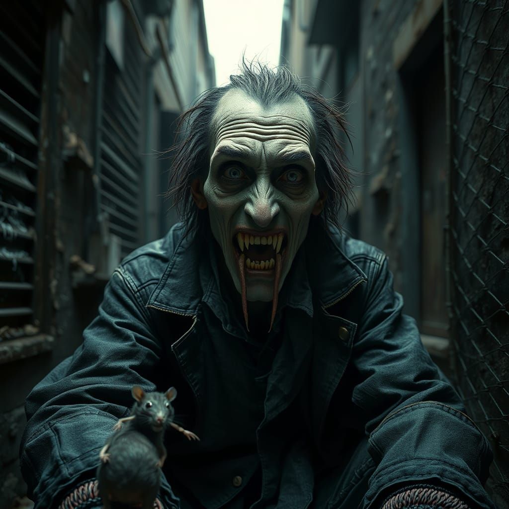 A haunting, close-up portrait of a homeless vampire in modern Gothic attire, set against a dark alleyway backdrop, with razor-sharp fangs and eerie, glowing highlights, evoking a Gothic horror scene.