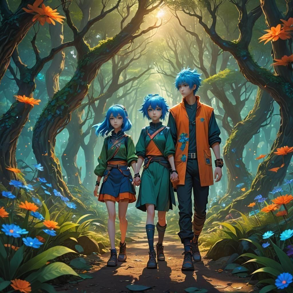 This image shows a blue-themed anime-style scene of a girl and boy holding hands. The digital painting features a complementary color scheme and intricate details, reminiscent of fantasy concept art.