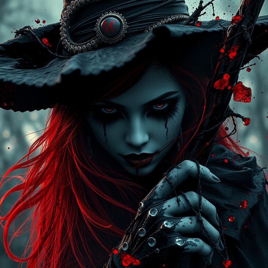 This haunting image showcases a mesmerizing dark fantasy witch, crafted with meticulous detail and depth, in a rich, atmospheric ink splash illustration