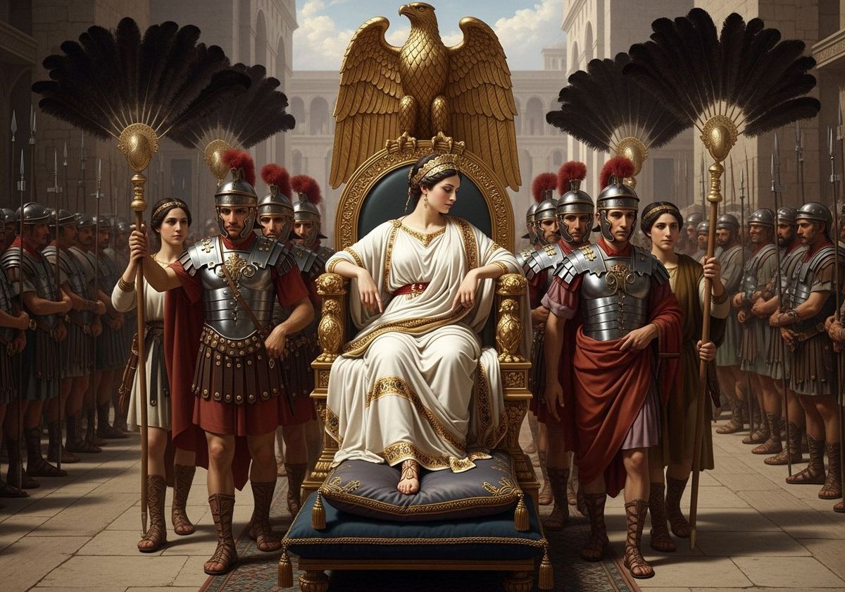 This image shows a Roman Empress being carried on a gold throne by soldiers, reminiscent of classical art. The scene, rendered with sharp focus and natural lighting, captures a moment of imperial procession and grandeur.