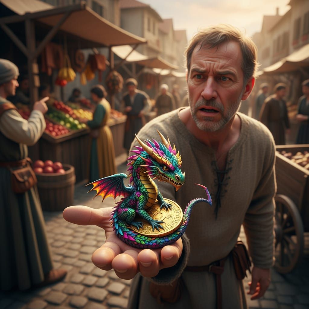 A brightly colored, miniature dragon sits protectively on a person's hand, guarding a large gold coin in a bustling medieval market setting.
