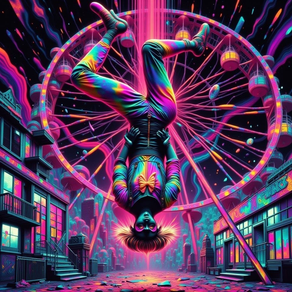 This image showcases a surreal, carnival scene featuring a vibrant, neon-lit ring-tailed lemur suspended upside down from a shattered ferris wheel. The lemur's enigmatic charm is accentuated by harlequin pants, mismatched striped gloves, and a radiant, glowing bowtie, set against a backdrop of digital fr...