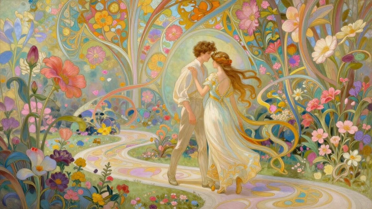 This digital painting depicts a couple walking on invisible paths in a dreamlike garden where flowers float mid-air. It features flowing lines and soft colors in a fantasy romance style.