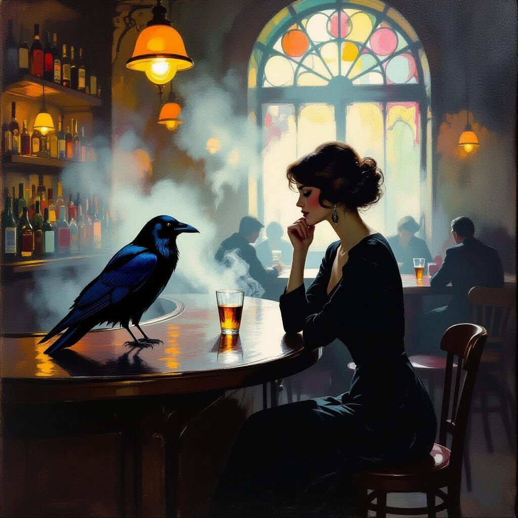 This image depicts a solitary woman in a dimly lit tavern with a raven companion. Rendered with bold colors and flowing lines, it evokes a dramatic, film noir atmosphere.