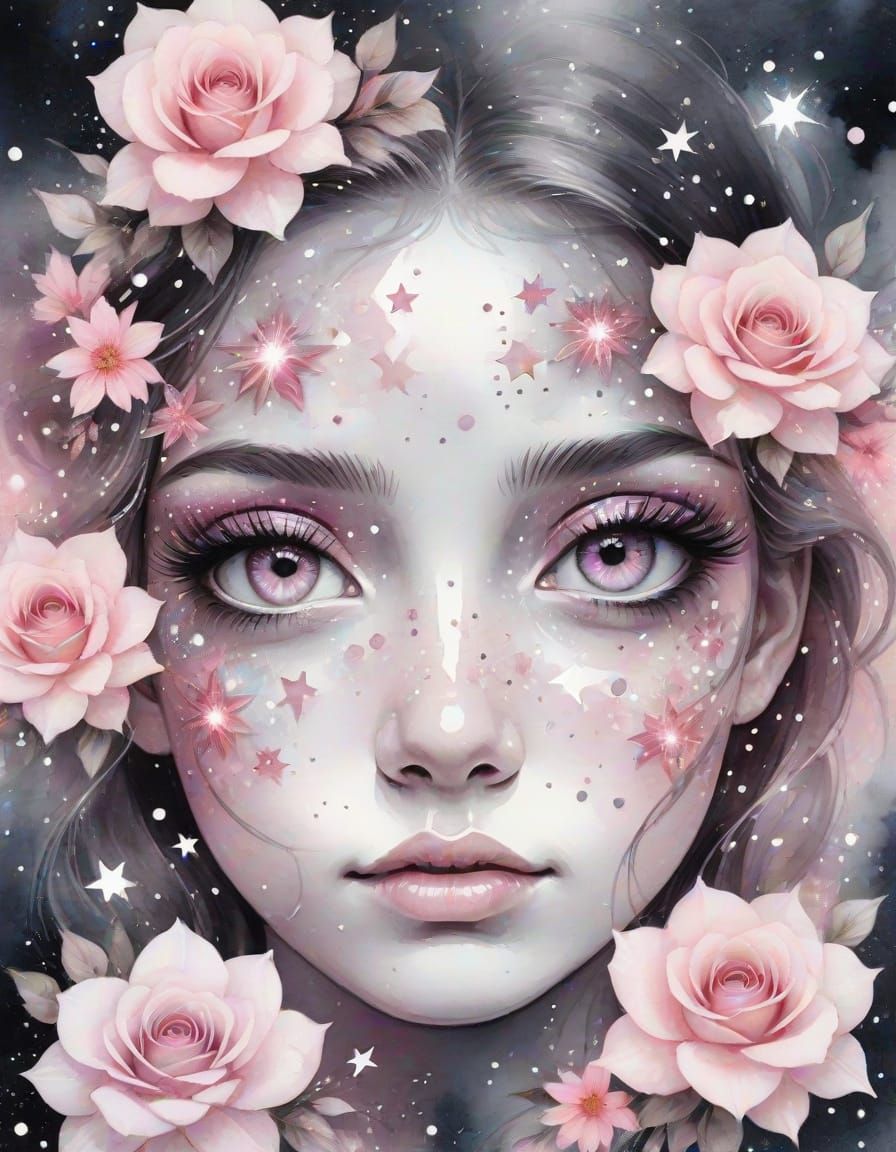 This image features a beautiful, dreamy portrait of rose quartz eyes surrounded by sparkling pink stars and delicate flowers, created in a unique watercolor style with double exposure and monochromatic hues.