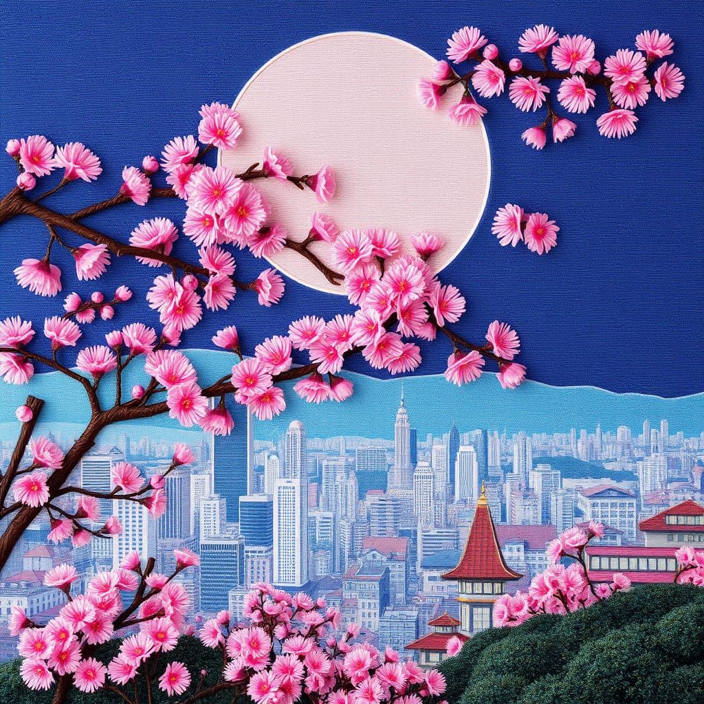 This image features a beautiful Japanese embroidered landscape of a cityscape adorned with abundant pink sakura flowers, evoking a serene and artistic atmosphere.
