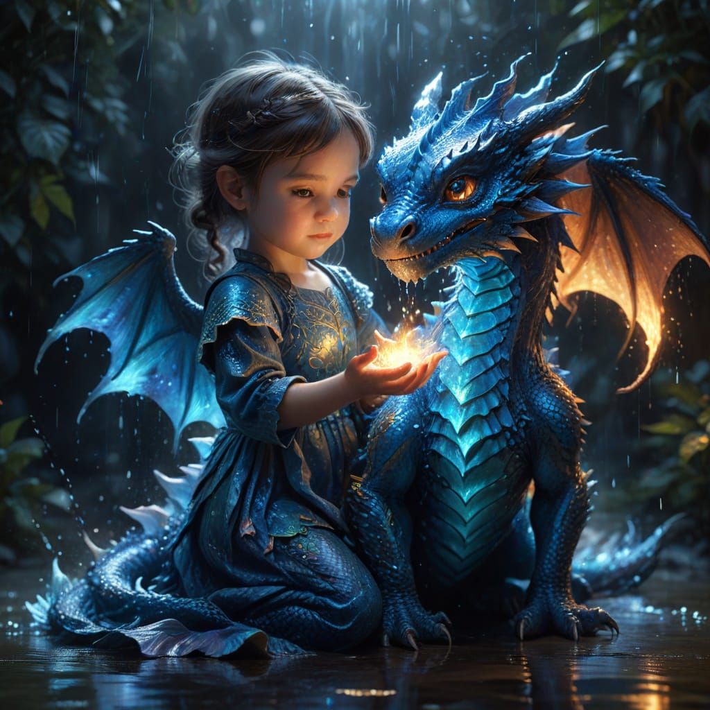 This digital artwork features a young girl cradling a luminous baby dragon, with magical blue energy emanating around them. Created with tiny brush strokes in an impressionistic fantasy realism style.
