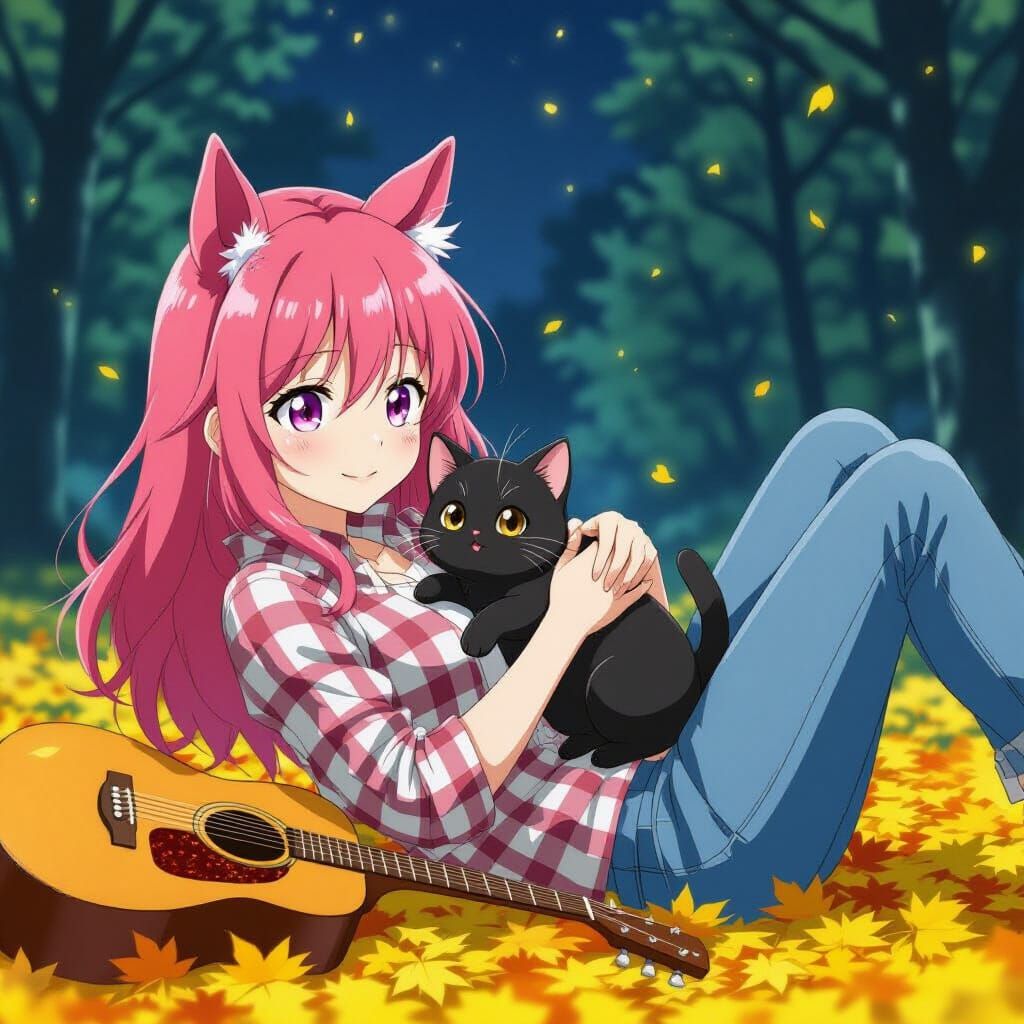 This anime illustration shows a woman with pink hair and horse ears holding a black kitten. She is lying on yellow leaves at night, with a guitar nearby. Features detailed linework and natural lighting.