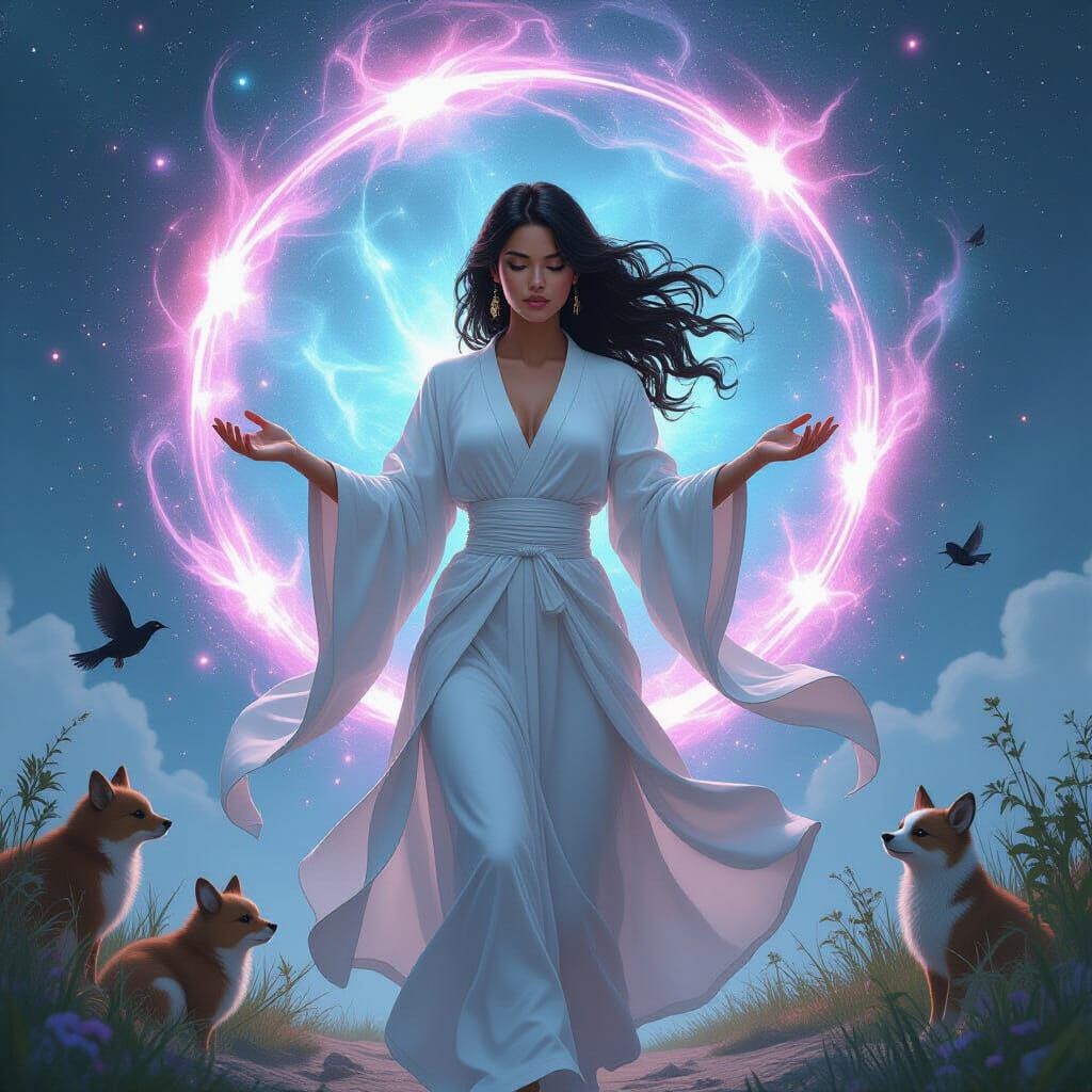 A vibrant image shows a woman in white robes escaping a dark matrix. She is surrounded by cosmic energy, healing the earth and its animals with mystical powers in a surreal, dreamy aesthetic.