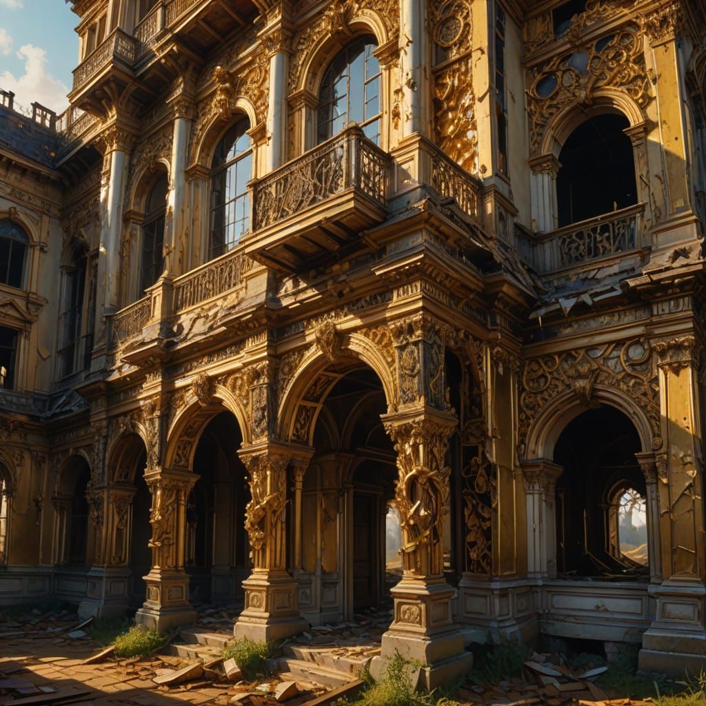 This oil painting depicts a surreal, decrepit palace with gold leaf cracking to reveal rotten timbers. Experience ornate, gilded decay under warm golden hour lighting with deep shadows.