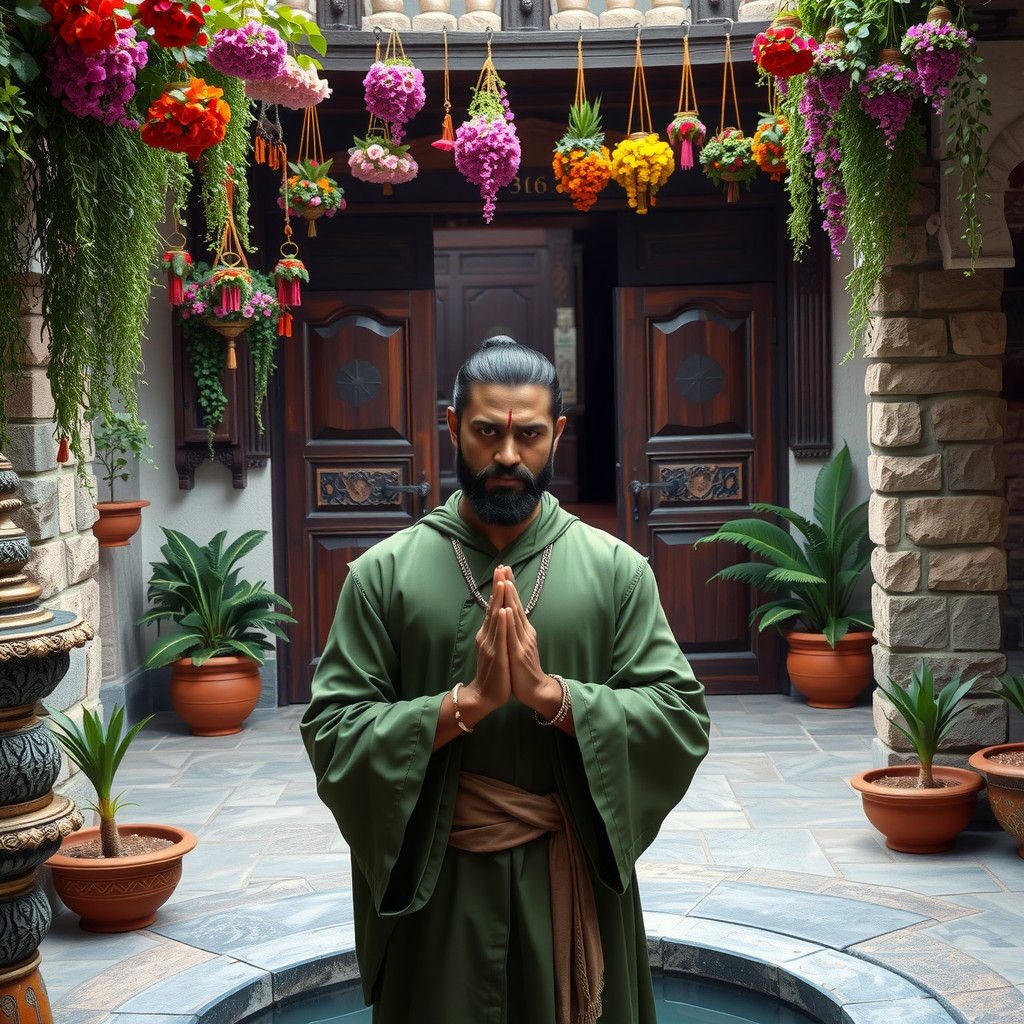 This image shows a muscular Indian man with a bindi, dark hair, and stubble, praying in a courtyard. The scene includes a Byzantine door, fountain, hanging flowers and plants in a fantasy art style.
