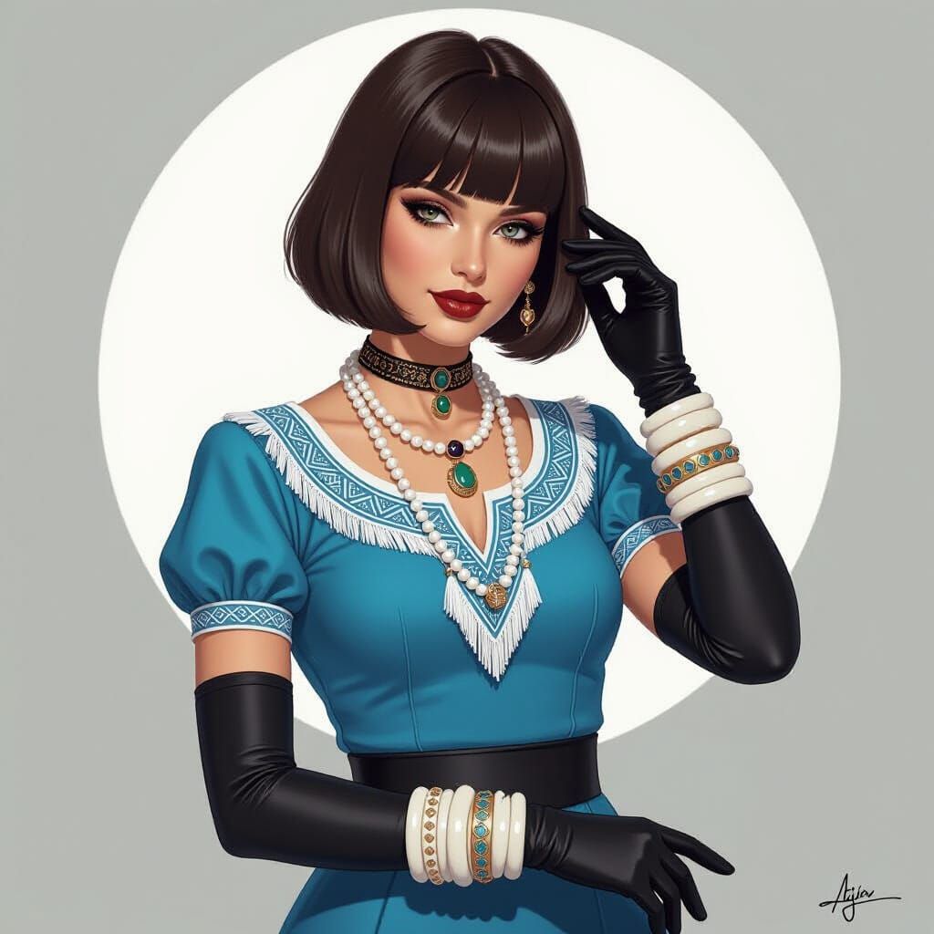 This detailed concept art depicts a beautiful woman with a bob haircut, wearing layered tops, white stone bracelets, and gloves. Cinematic lighting enhances the scene.