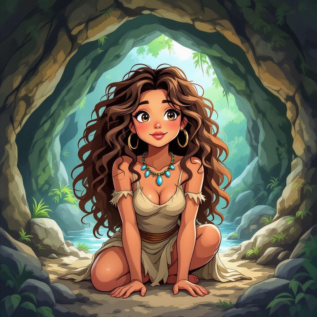 A prehistoric woman with dark skin and long, messy curly hair is depicted inside a cave, rendered in a charming watercolor anime style.