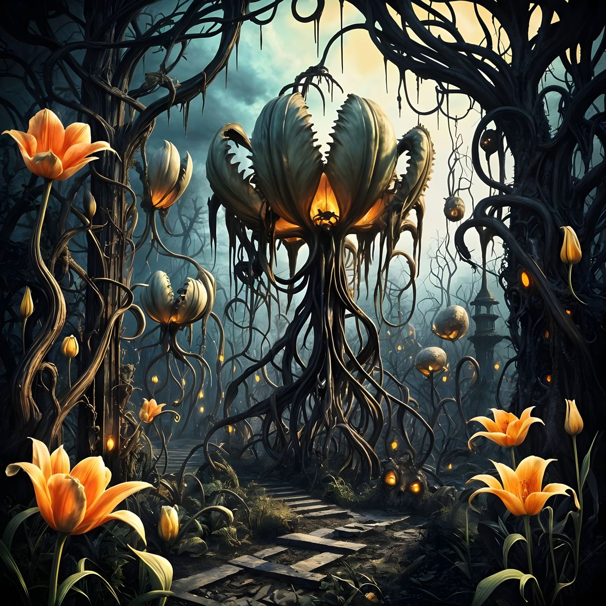 A medium shot of a creepy, abandoned biomechanical garden. Black vines wind through giant tulip flowers with teeth and slime, rendered with dark organic forms and twisted textures in muted triadic colors.