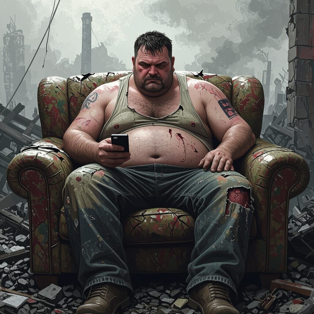 This image shows a disheveled man on a tattered sofa amidst debris. The art style evokes a dark, post-apocalyptic scene with cyberpunk elements, reminiscent of dystopian art.