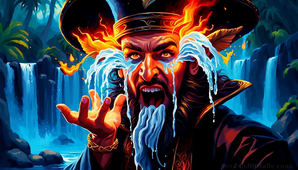 This image shows a magician figure with waterfalls cascading from their mouth, eyes, and ears, set against a tropical oasis backdrop. Rendered as fantasy art in dark oil painting colors.