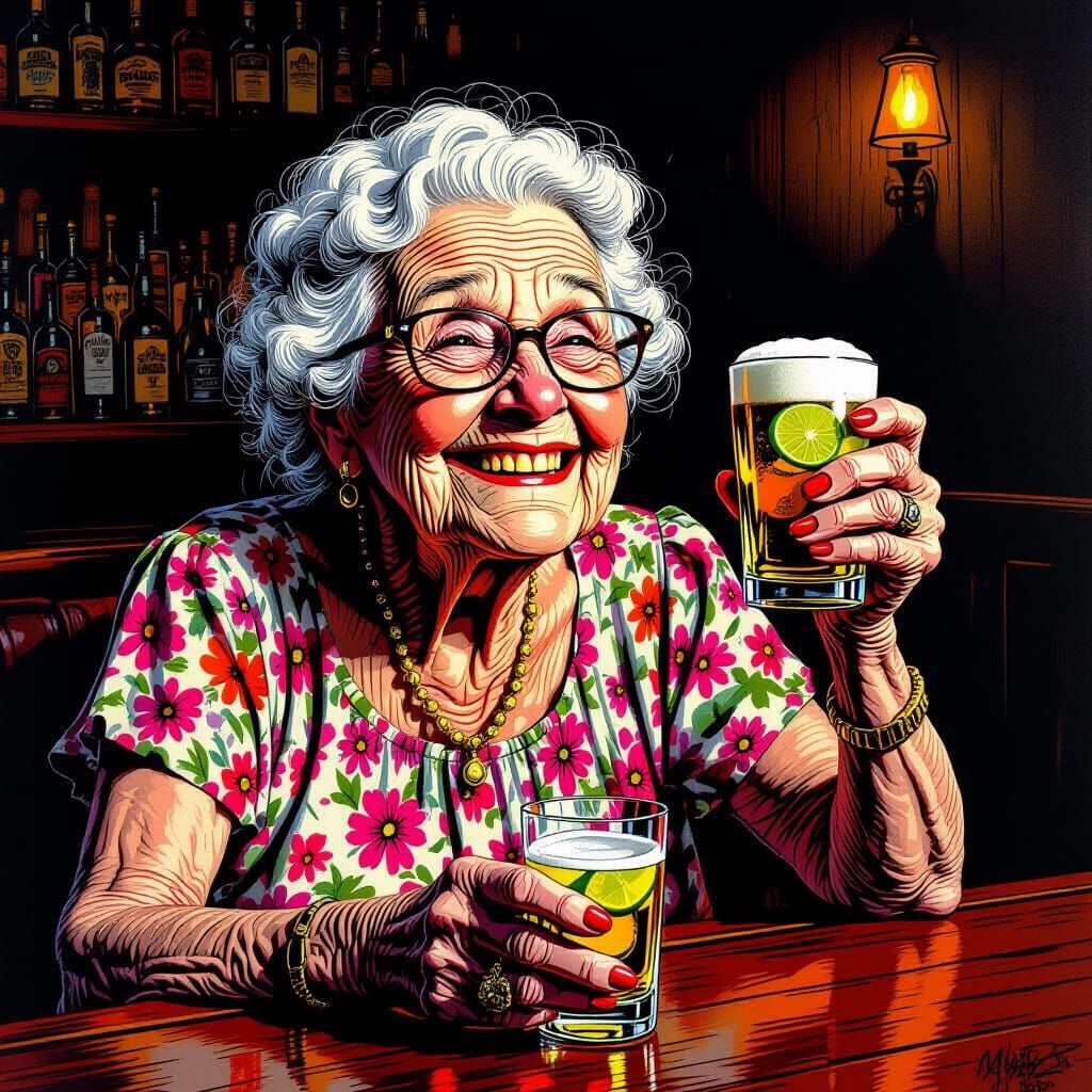 This image shows an elderly woman with a toothless grin enjoying a beer and tequila at a bar. The image is a hyper-realistic caricature with bold lines and vibrant colors in a pop art style.