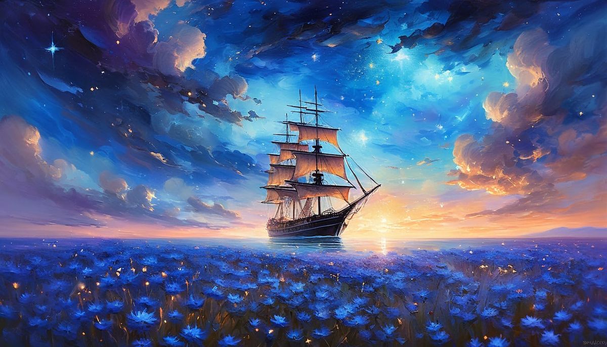 "A breathtaking cosmic scene blending the beauty of space and the sea. A majestic nebula, swirling with deep blues, purples, and glowing stardust, stretches across the sky, resembling a celestial watercolor painting. Below, an endless field of gently swaying blue cornflowers mirrors the nebula’s hues, ...