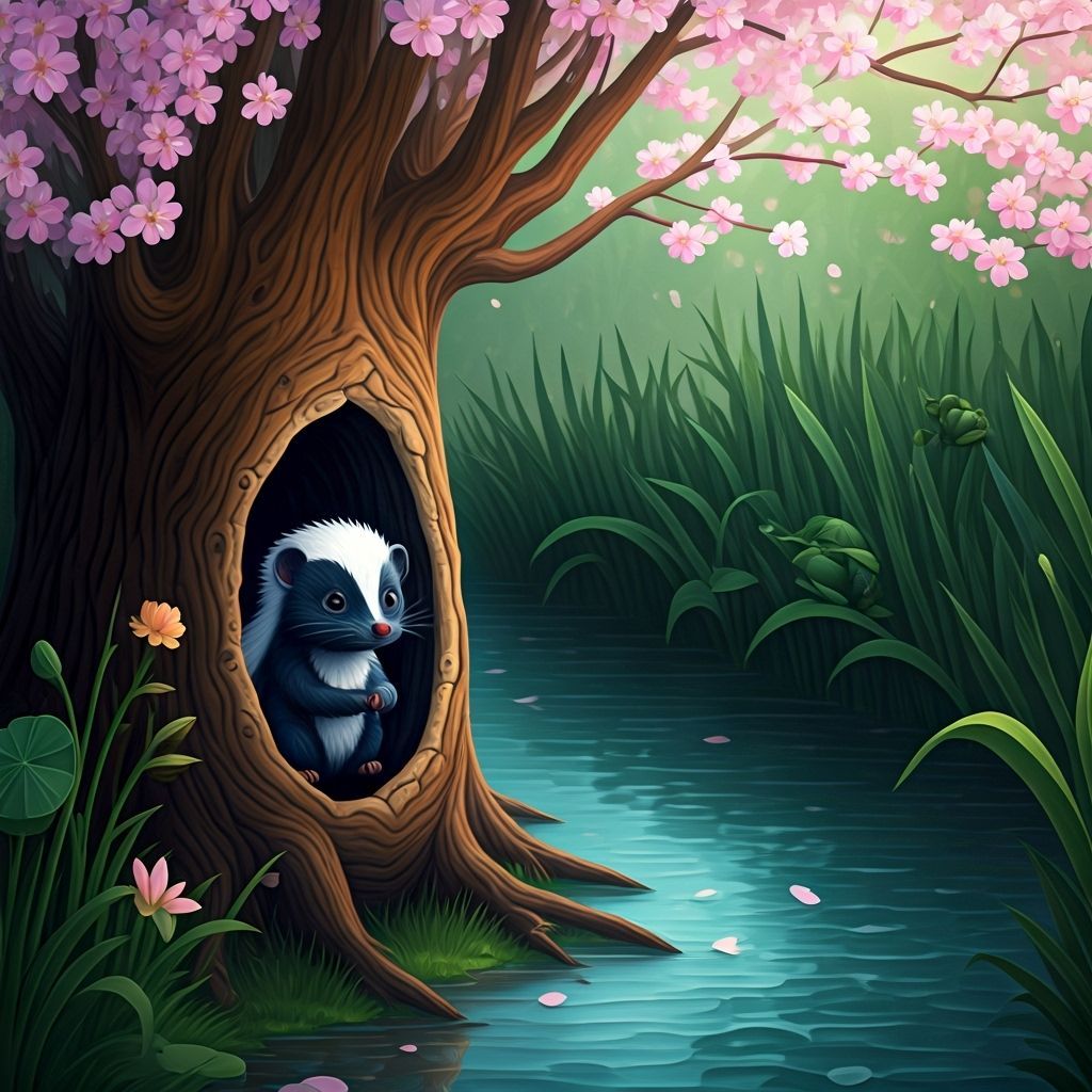 Paper cutting and quilling Art ,a little white cute skunk sits inside a tree hollow at the edge of the green riverbank under ancient Cherry blooming trees, wild floral,a big frog on lotus leaf,silhouette style figures, pastel tones, Sharp focus, 3D,digital full colors, in the style of Fiona Rae. vivid ...