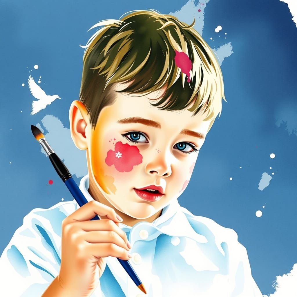This image showcases a young student rendered in a bold watercolor style with prominent brushstrokes, capturing a sense of artistic expression.
