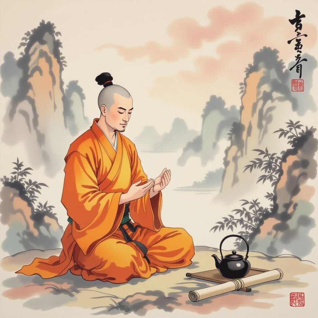 A serene image of a Shaolin monk training in a pastel landscape. The scene includes a traditional scroll and teapot, rendered with soft brushstrokes and delicate color transitions in an Asian art style.