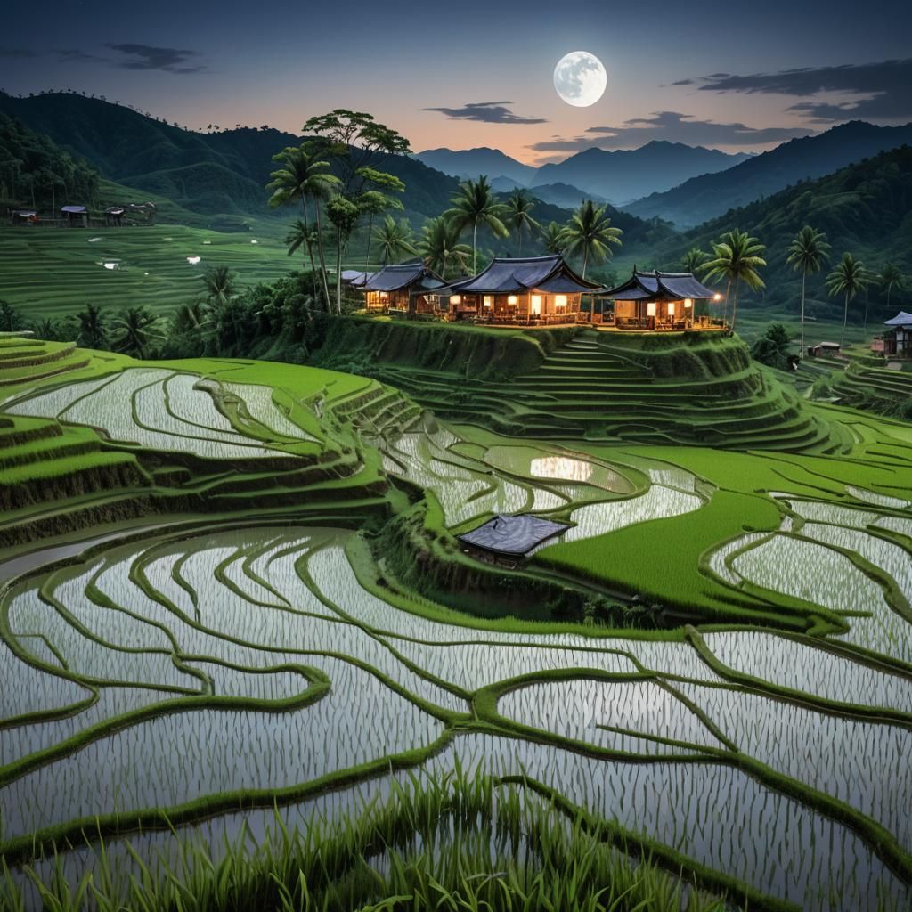 This image shows a tranquil night scene of terraced rice fields. A small hut sits near a tree, with a wide-angle view of lush green fields under a clear, moonlit sky, as a detailed matte painting.