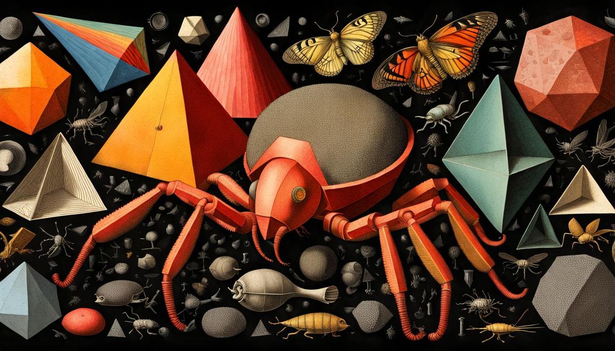 This image shows a crowded, colorful stipple engraving print of musical instruments, with a multistable perception effect. The artwork features dripping paint and dissected faces, reminiscent of golden age illustration.