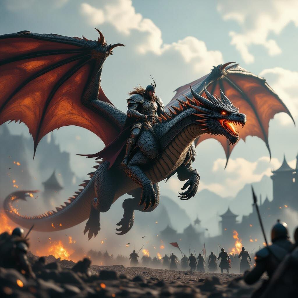 A dragon warrior riding on a firespittingdragon flying above a battlefield Cinematic film still, shot on v-raptor XL, film grain, vignette, color graded, post-processed, cinematic lighting, 35mm film, live-action, best quality, atmospheric, a masterpiece, epic, stunning, dramatic