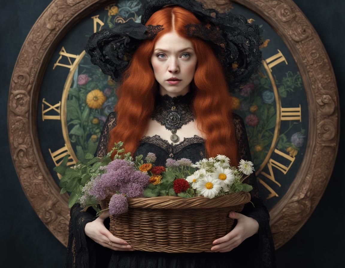 A digital painting of a red-haired witch in a black lace dress, holding a basket of flowers and herbs. The artwork features vibrant colors and hyperrealistic details in a Klimt-inspired style.