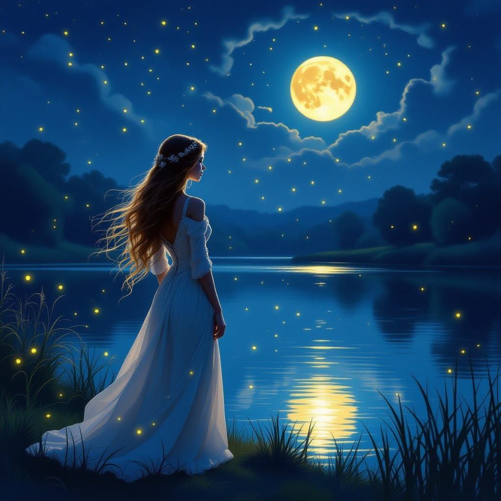 A beautiful woman with flowing goldrose hair stands by a serene lake at night. Ethereal moonlight reflects on the water, with dancing fireflies creating a magical glow. Fantasy art style with rich colors and soft lighting.