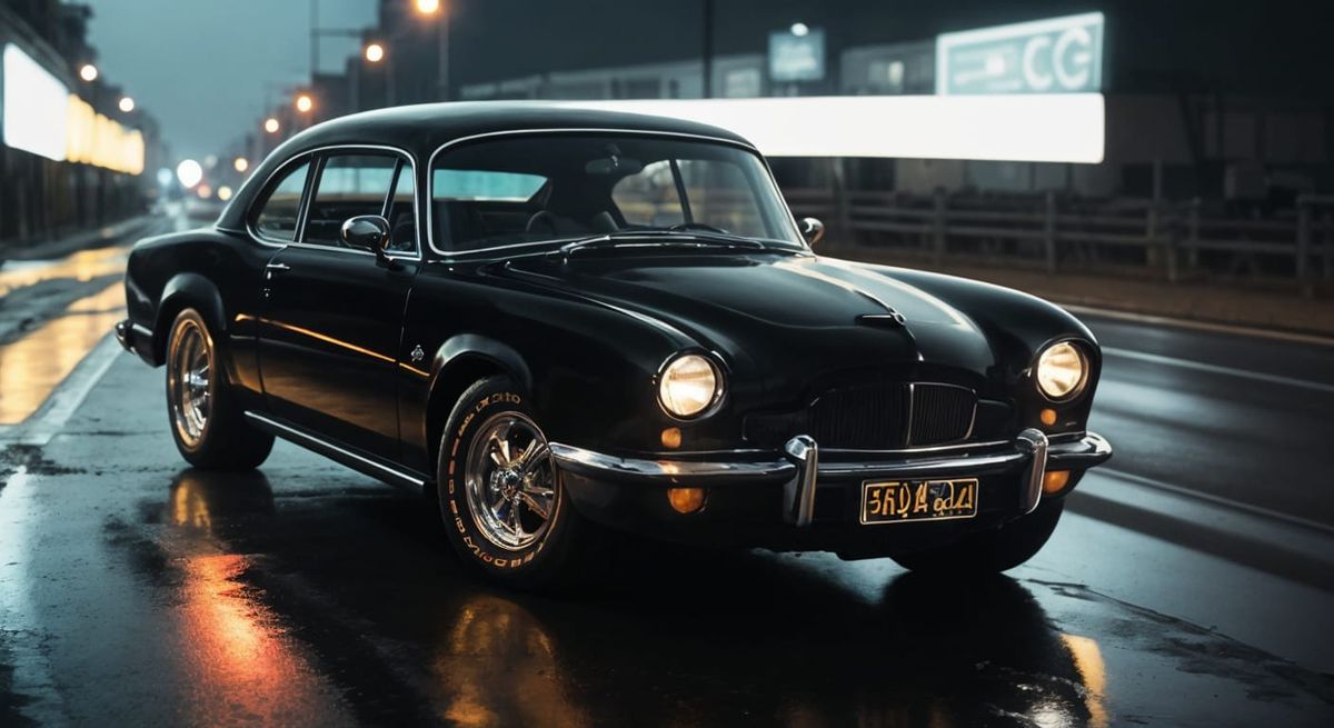 This image showcases a large, retro-style black coupe photographed at night. The dark scene is illuminated by the car's headlights in a vignette panorama, rendered in detailed 8K resolution.