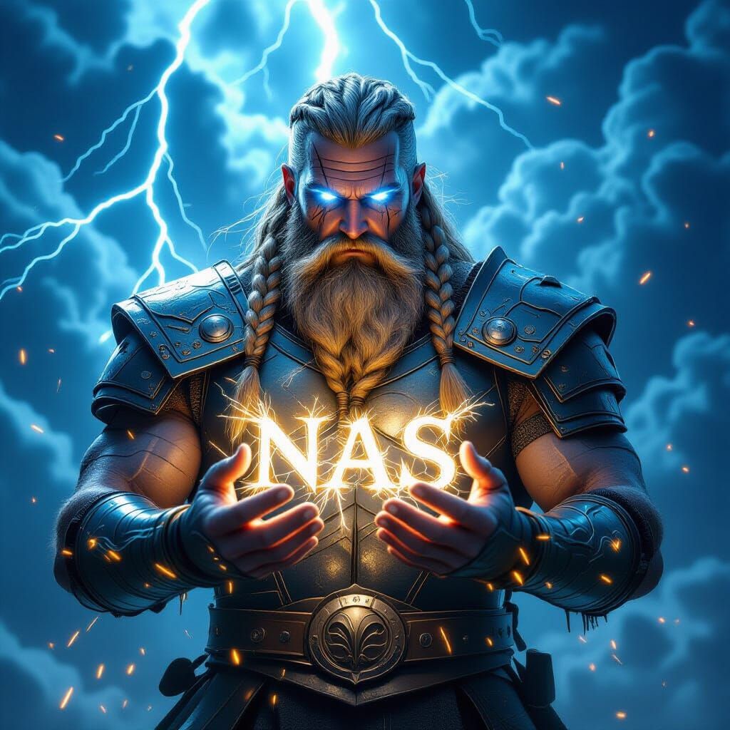 A photorealistic image of an aged Thor with glowing eyes and braided beard, clad in battle-worn armor. He summons lightning, forming the letters 'NAS' amidst a stormy, divine backdrop in an epic fantasy style.