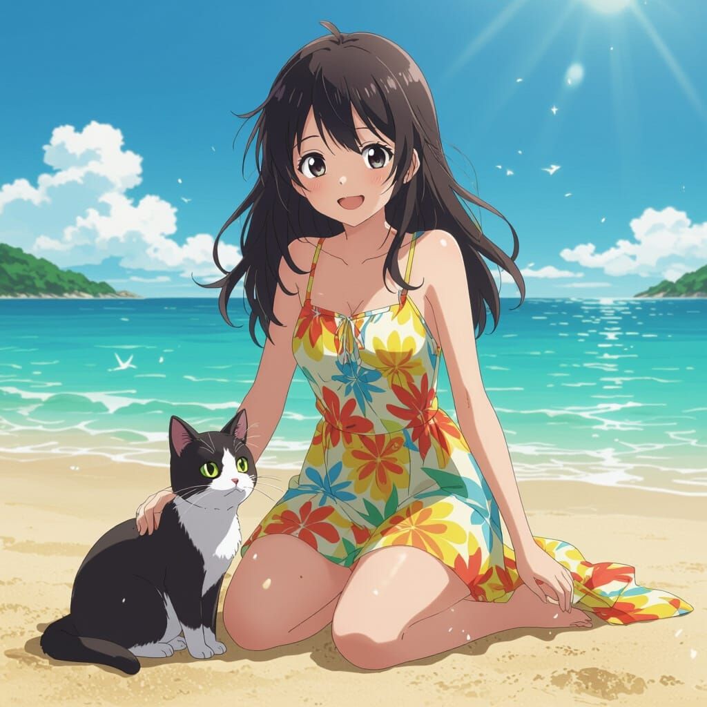 This image shows an anime girl in a summer dress playing with a cat on a sandy beach. The digital artwork features soft lighting and realistic details.