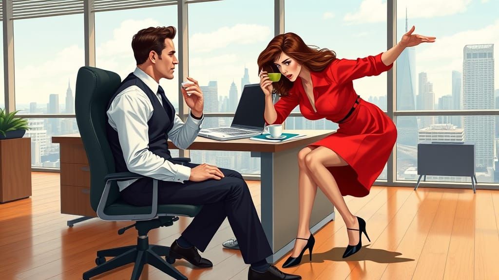 A photorealistic image of a male executive at his desk in a modern office, as his secretary spills coffee. The scene has a vibrant, cinematic feel.