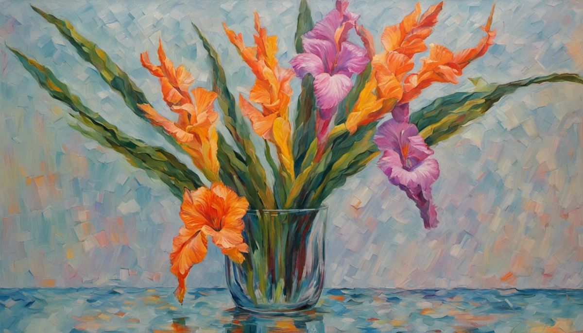 This image shows gladiolus and bird-of-paradise flowers arranged in a glass vase. It is rendered as an expressionist oil painting with impasto techniques and thick layers of textured paint.