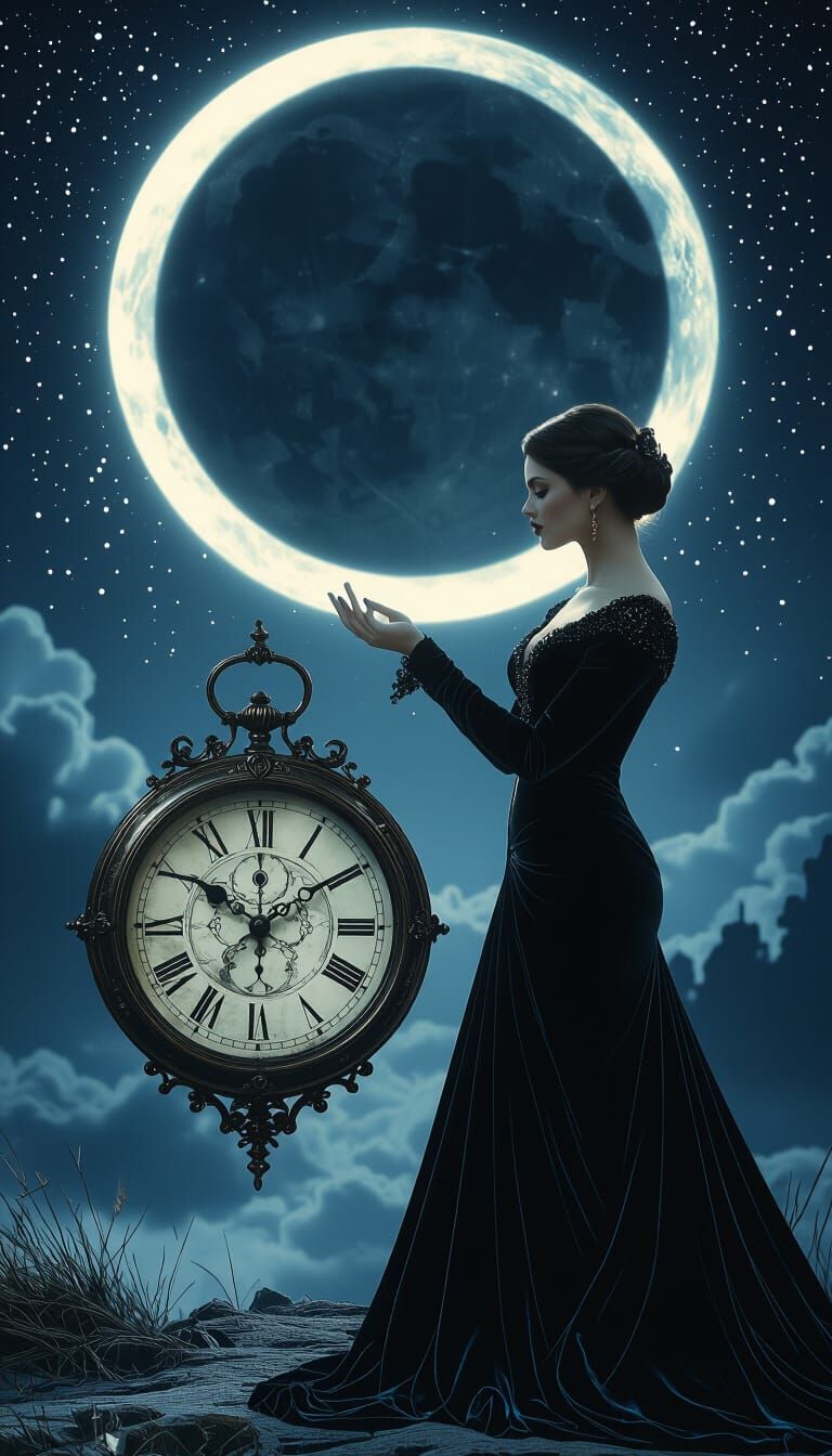 This AI-generated image depicts a mysterious woman in a velvet gown holding a detailed, broken clock beneath a dramatic lunar eclipse. The scene features ethereal, cool lighting and a starry background, evoking a moody, otherworldly atmosphere.