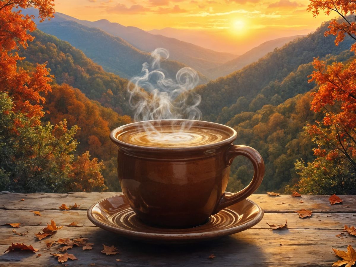 This image shows a steaming coffee mug on a cabin porch, overlooking a vibrant autumn Appalachian valley sunrise. Rendered in an acrylic painting style with thick, expressive brushstrokes.