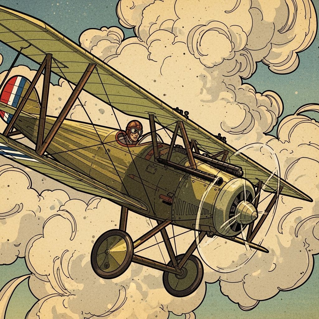 A vintage illustration of an Österreichische Aviatik D.I biplane soaring through a cloudy sky. The artwork evokes the style of Alphonse Mucha with bold lines and muted colors.