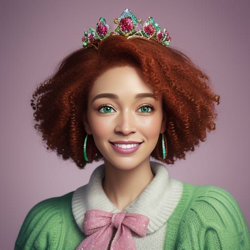 A vibrant digital artwork of a woman in a pink cardigan holding a decorated glass. The image features a colorful background with sparkling stones and glitter. The art style is hyperrealistic and vividly detailed.