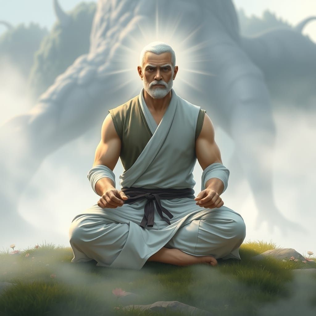 This image shows a superhero meditating outdoors in a monk's vest. Ethereal energy radiates from his spiritual form, set against a dreamy, hyper-detailed landscape in a vibrant fantasy style.