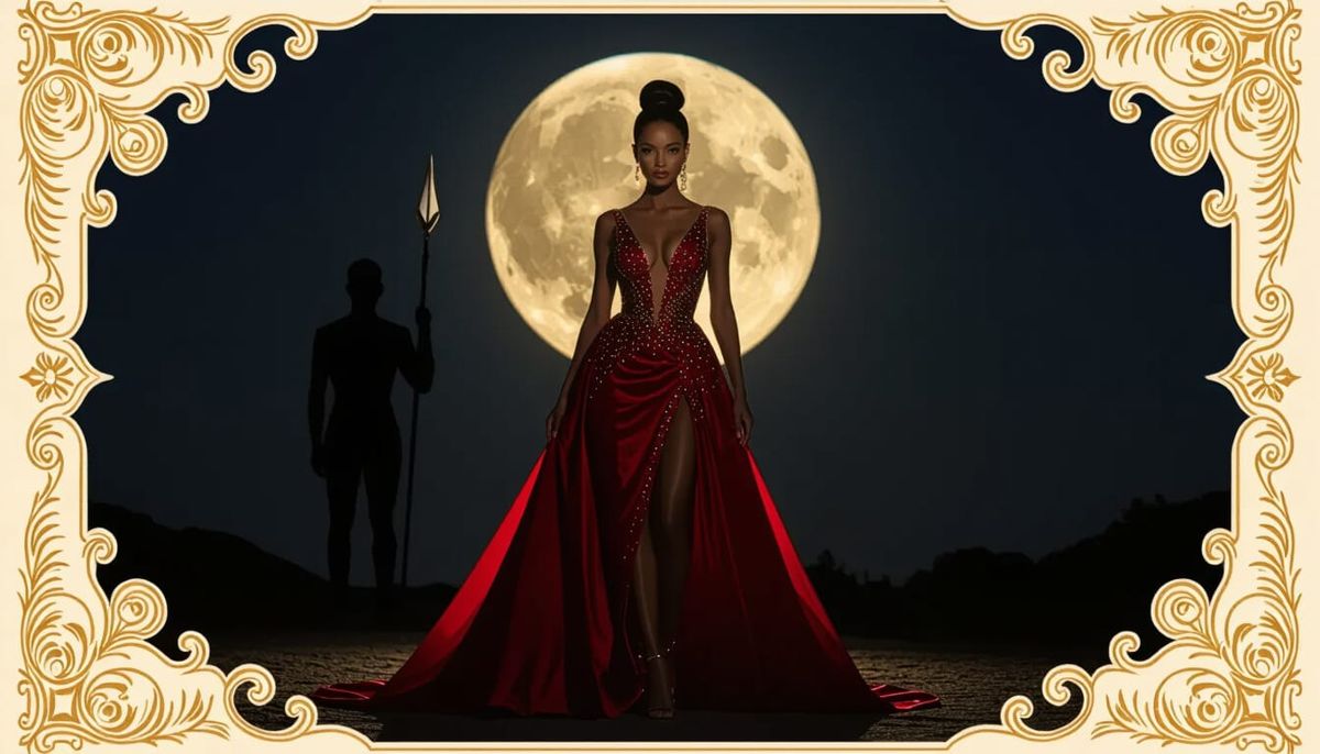 está de noite a única iluminação presente é a da lua a sua frente fazendo uma sombra em um homem negro de 3 metros ao fundo da imagem mal aparecendo e com silhueta esfumaçada, a sua frente uma bela mulher com um vestido vermelho e com detalhes dourados em círculos misturados com corações, seu vestido ...